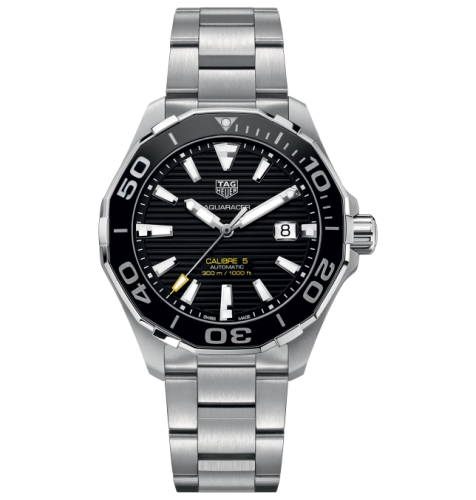 TAG Heuer Aquaracer men?s watch featuring a black dial with stick/dot indexes, Calibre 5 automatic movement, and stainless steel bracelet. With sapphire crystal and 300m water resistance, it?s designed for diving performance and everyday elegance.