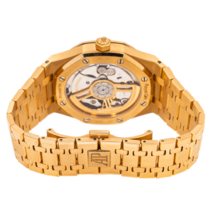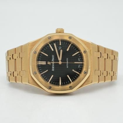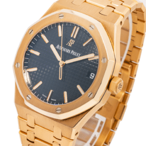 The Audemars Piguet Royal Oak Selfwinding 15510OR is a refined luxury timepiece crafted in 18kt rose gold, featuring the iconic octagonal bezel and a striking black ?Grande Tapisserie? dial. Powered by a high-precision automatic movement with an extended power reserve, this watch delivers exceptional performance and reliability. Its integrated bracelet ensures superior comfort, while the bold yet elegant design makes it suitable for both formal and casual occasions. Combining premium materials with timeless craftsmanship, this Royal Oak offers durability, sophistication, and versatility?making it a perfect addition to any luxury watch collection.