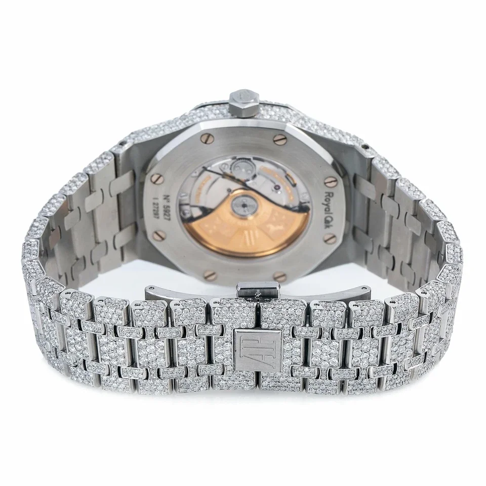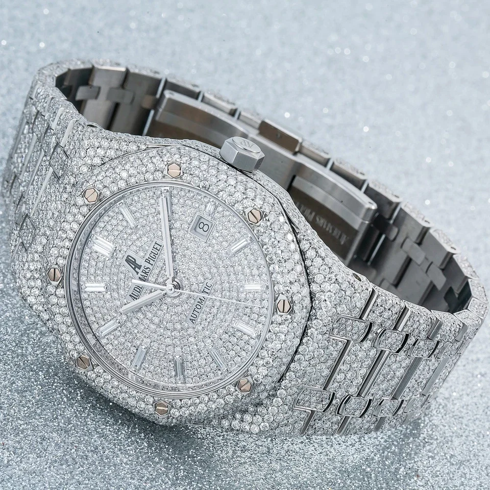Iconic Styling: The Audemars Piguet Royal Oak 41MM Silver Dial Iced Out 15400ST Super Clone is a luxury-inspired timepiece that radiates sophistication. Featuring a striking iced-out bezel, silver dial, and the signature Royal Oak bracelet, it delivers bold elegance with automatic precision.