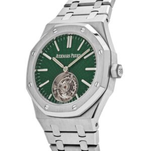 The Audemars Piguet Royal Oak Selfwinding Flying Tourbillon (Ref. 26532IC.EE.1220TI.01) is an ultra-exclusive luxury timepiece crafted in lightweight titanium and enhanced with an 18K white gold bezel set with baguette-cut emeralds. Featuring a striking green ?Tapisserie? dial and a visible flying tourbillon, this watch represents the pinnacle of haute horology. Powered by an advanced in-house automatic movement, it offers precision, durability, and exceptional craftsmanship. With its limited-edition status and iconic Royal Oak design, this watch delivers unmatched elegance, performance, and collectability?perfect for elite collectors and luxury enthusiasts.