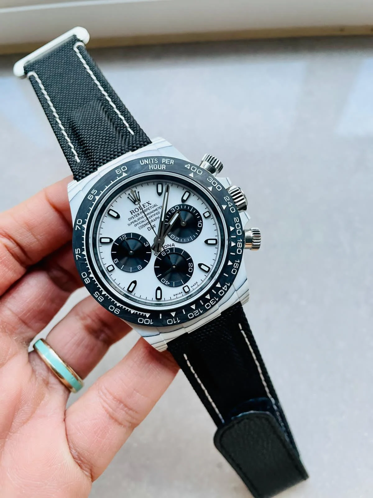 The Daytona DIW PANDA White Carbon Noob Best Edition Super Clone features a lightweight white carbon case and bezel paired with a striking white and black panda dial. Powered by the high performance SA4130 V2 automatic movement with 72-hour power reserve, this 40mm chronograph delivers bold racing-inspired luxury styling.