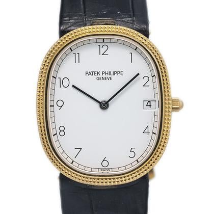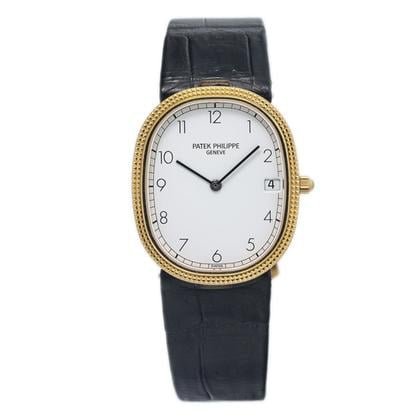 The Patek Philippe Golden Ellipse Quartz is a refined 27mm yellow gold dress watch featuring a minimalist white dial with Arabic numerals. Its ultra-thin 6mm case and quartz movement offer precision and timeless elegance in the iconic Ellipse design.