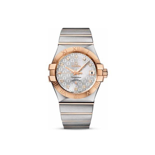 35 mm brushed stainless steel and 18K red gold case, transparent back, domed scratch-resistant sapphire crystal with anti-reflective treatment inside, silver dial with Omega logo pattern and diamond hour markers, self-winding chronometer Omega 2500 movement… Available – your luxury watch destination.