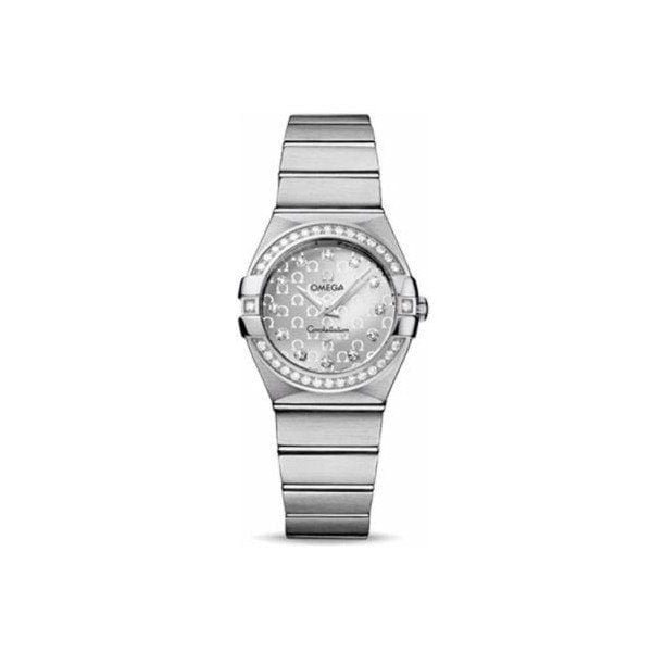WATCH SPECIFICATIONS: 27 mm brushed stainless steel case, diamond bezel, domed scratch-resistant sapphire crystal with anti-reflective treatment inside, silver dial with Omega logo pattern and diamond hour markers, quartz Omega 1376 movement, approximately 32 months… Available – your luxury watch destination.