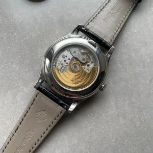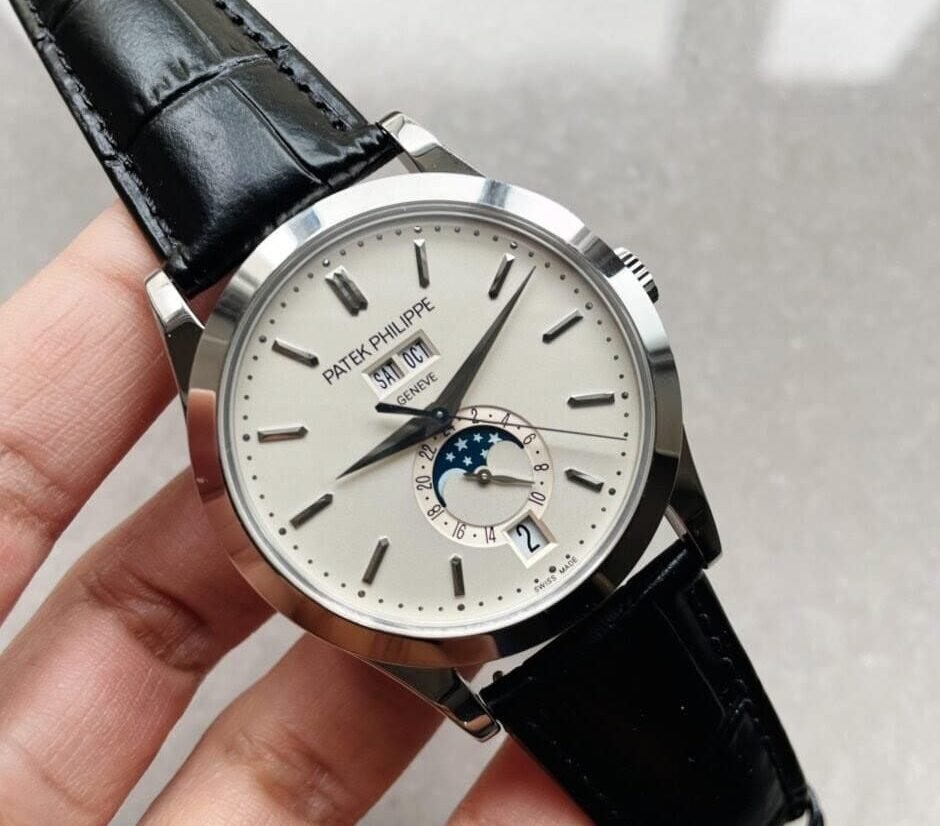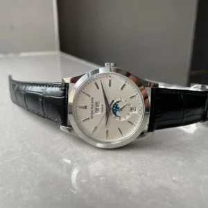 The Patek Philippe 5396 Annual Calendar Moonphase ZF 1:1 Best Edition Super Clone combines classic elegance with practical complications. Featuring a 38.5mm stainless steel case, white/blue dial with Roman numerals, moonphase, and annual calendar functions, paired with a black leather strap and A324 automatic movement.