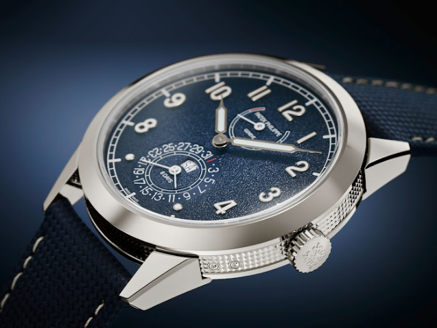 Discover timeless elegance and practical functionality with the Patek Philippe Calatrava Pilot Travel Time, a luxury timepiece designed for modern travelers. Featuring a striking blue sunburst dial paired with a durable blue fabric strap, this watch perfectly balances sporty aesthetics with refined sophistication.