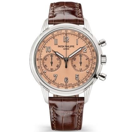 Patek Philippe 5172G-010, 41mm white gold case with pink dial and Arabic numerals. Automatic Caliber CH 29-535 PS movement with 65h power reserve and chronograph function. Finished with a brown crocodile leather strap and fold clasp.