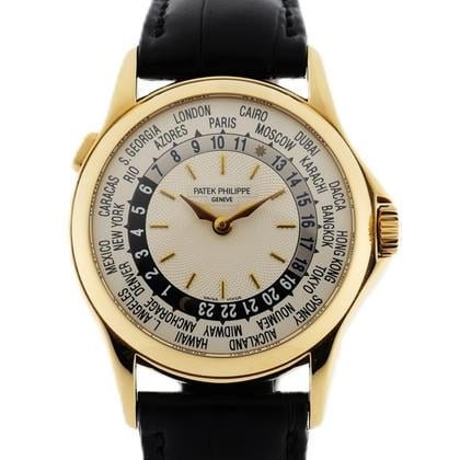 Patek Philippe World Time 5110J, elegant 37mm yellow gold case with silver dial and sapphire crystal. Powered by automatic Caliber 240 HU with GMT/world time function, 48h power reserve, and display case back. Finished with black crocodile leather strap.