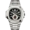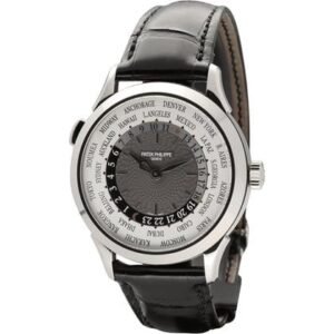 Patek Philippe World Time 5230G-014, 38.5mm white gold case with grey dial and sapphire crystal. Automatic Caliber 240 HU with world time function and 48h power reserve. Finished with a black crocodile leather strap.