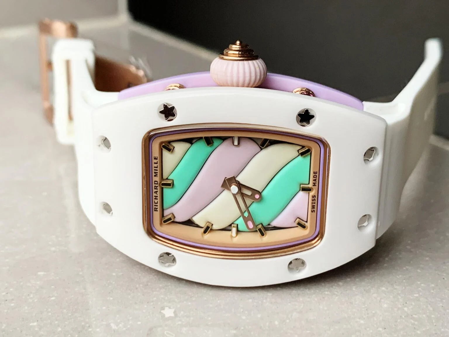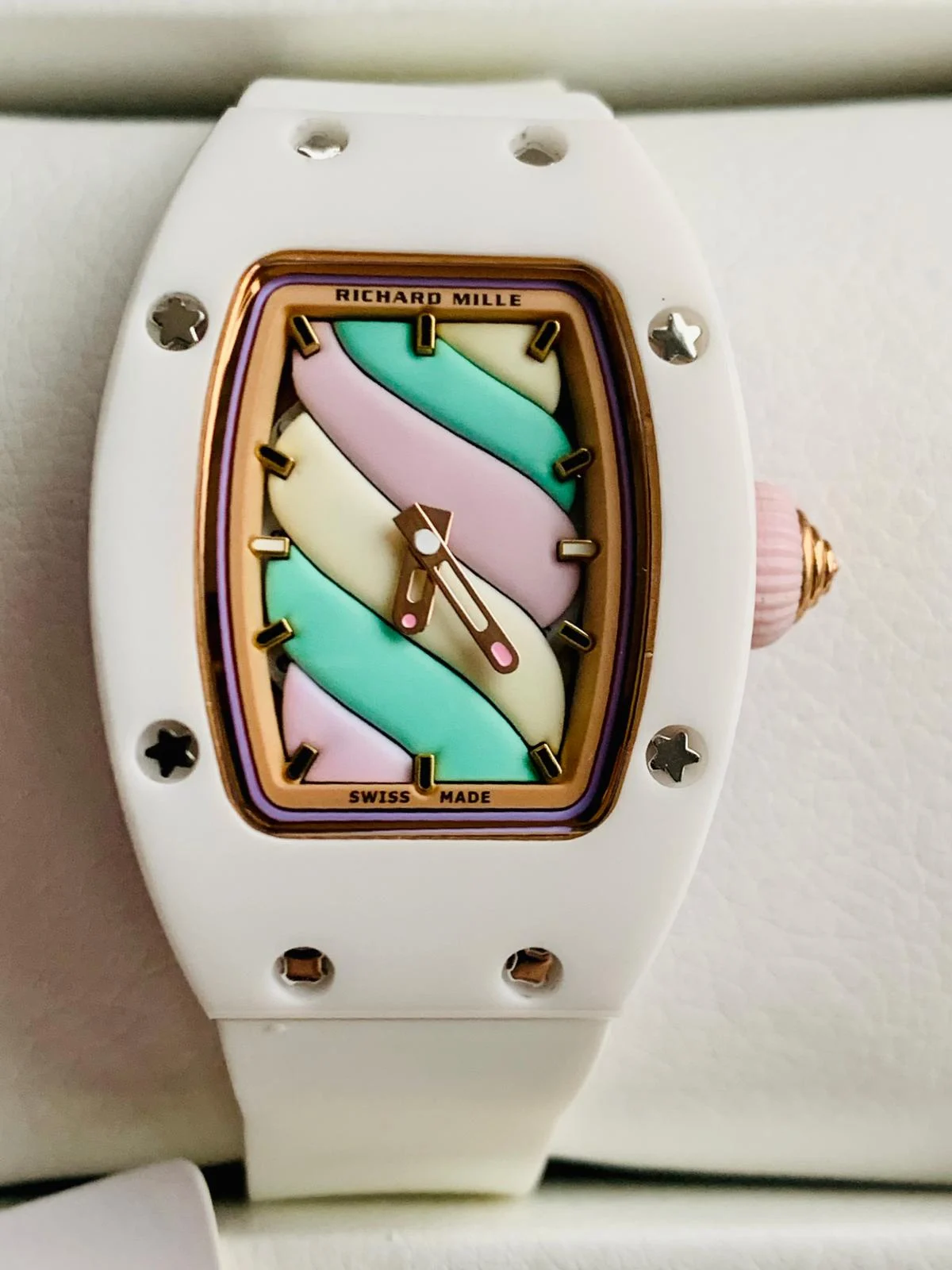 The Richard Mille RM07-03 Candy Watch OXF Best Edition Super Clone is a vibrant unisex luxury timepiece featuring a colorful dial, skeletonized hands, and MIYOTA 6T51 automatic movement. With a playful Candy-inspired design and durable white rubber strap, it combines high end style with everyday comfort.