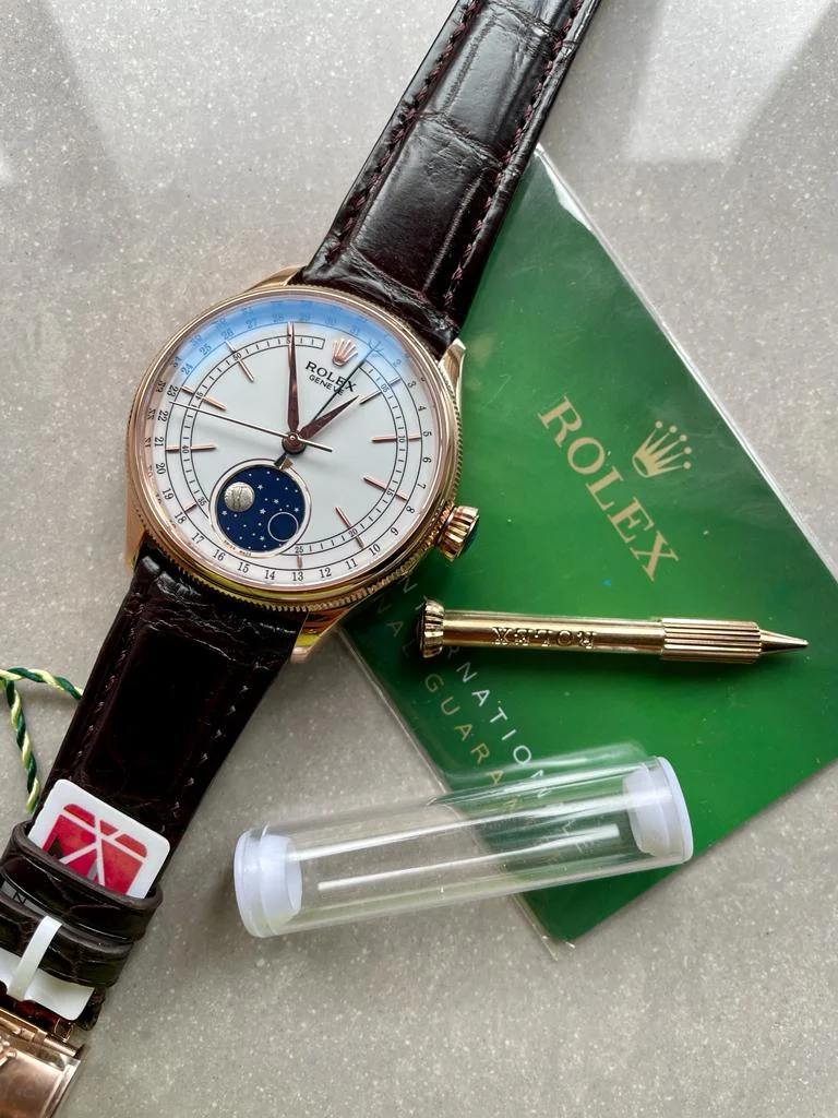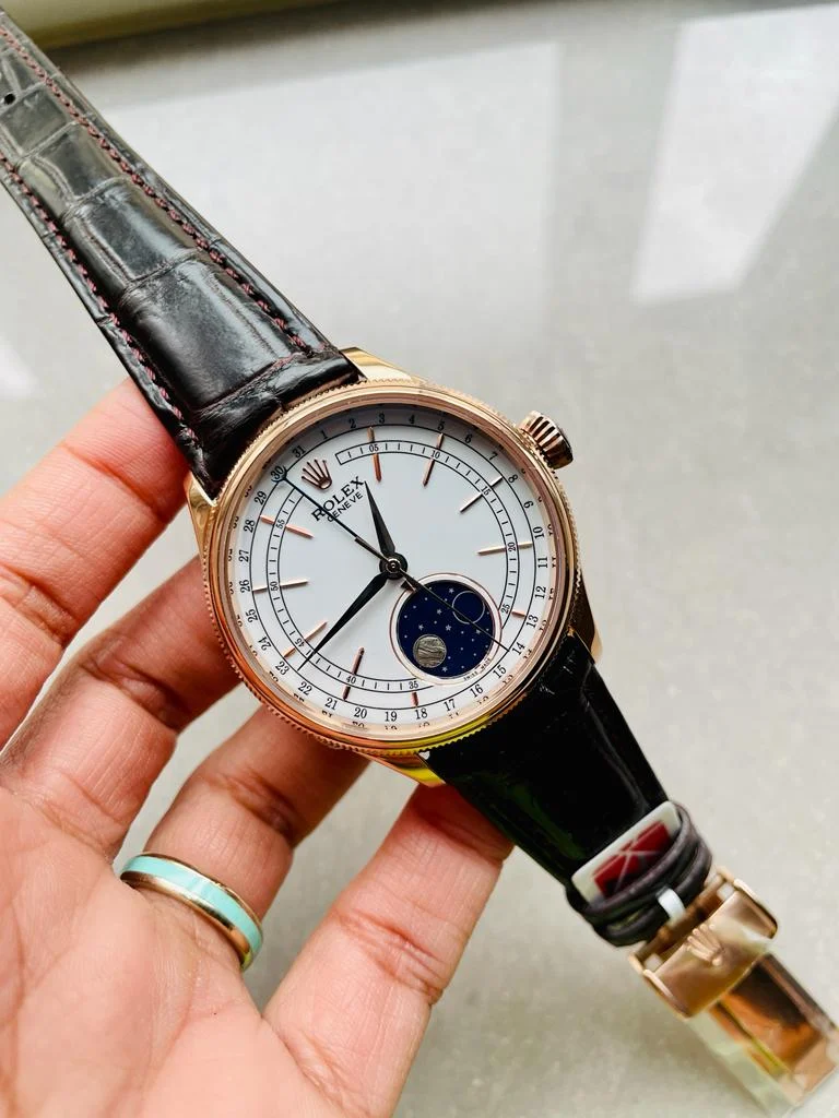 The Rolex Cellini Moonphase 50535 RG Super Clone combines classic elegance with modern craftsmanship. Featuring a 39mm rose gold case, white dial with moonphase display, and leather strap, it houses the precise KZF Asia 3195 automatic movement with a 48-hour power reserve.