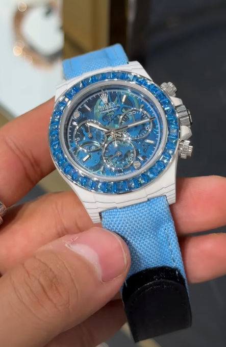 Explore the stunning Rolex Cosmograph Daytona inspired by the Artisans de Gen?ve ?Arolla? project ? a bespoke luxury timepiece crafted for true watch enthusiasts. Featuring a skeletonized dial that reveals intricate mechanical artistry, a sapphire gem-set bezel for a bold premium look, and high-quality customized straps, this watch blends innovation with iconic design. Based on the legendary Rolex Daytona (ref. 116500), this personalized masterpiece reflects the beauty of the Swiss Arolla glacier while delivering exceptional style and performance.