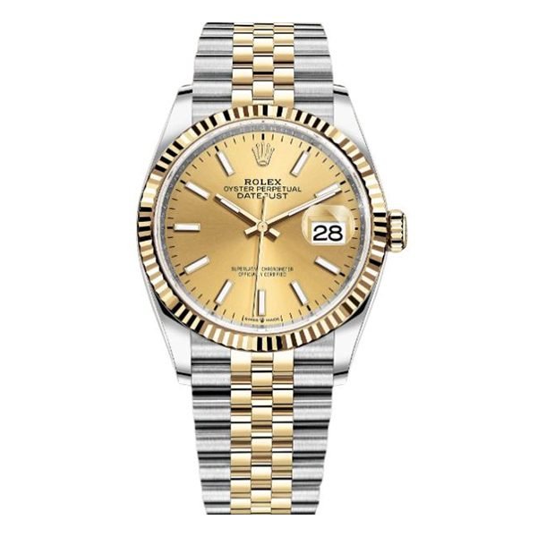Rolex Datejust 126233 CHIJ Champagne Index Dial Fluted Bezel 36mm Oystersteel and Yellow Gold Unisex Rolex Datejust 126233-0015 features a polished 904L Oystersteel stainless steel case and polished solid 18k yellow gold with brushed 904L… Available – your luxury watch destination.