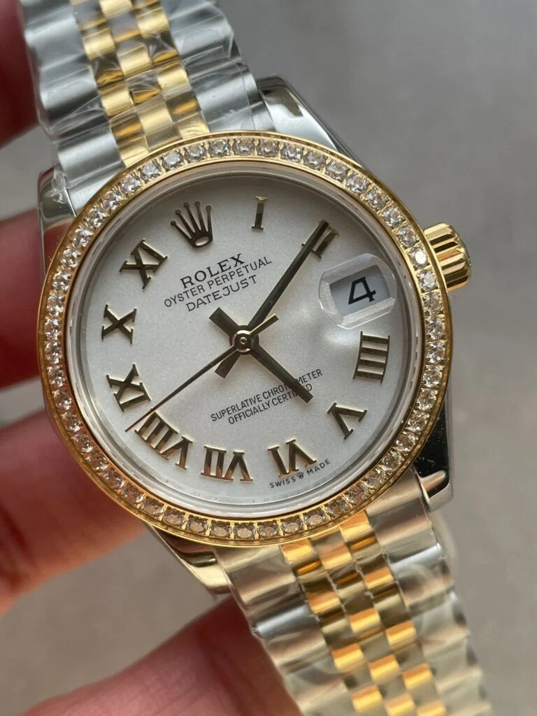 The Rolex Datejust 31mm 278273 Super Clone combines timeless elegance with luxury detailing. Featuring a white dial with diamond hour markers, diamond bezel, and yellow gold/stainless steel Jubilee bracelet, it houses the precise Calibre 2236 automatic movement with a 55-hour power reserve.