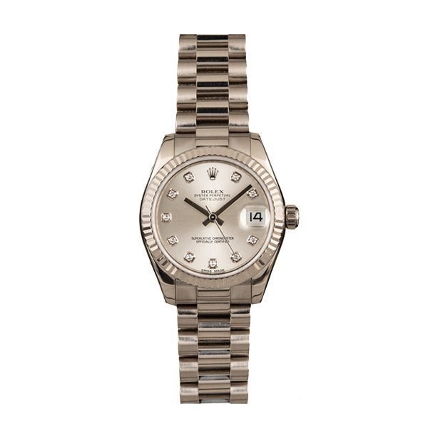 WATCH SPECIFICATIONS Brand: Rolex Ref. 178279 Collection: Datejust Case Material: 18K white gold Movement: Automatic Case shape: Round Bracelet: 18K white gold bracelet strap Crystal: Scratch resistant sapphire Dial: Silver Diameter: 31mm Available – your luxury watch destination.
