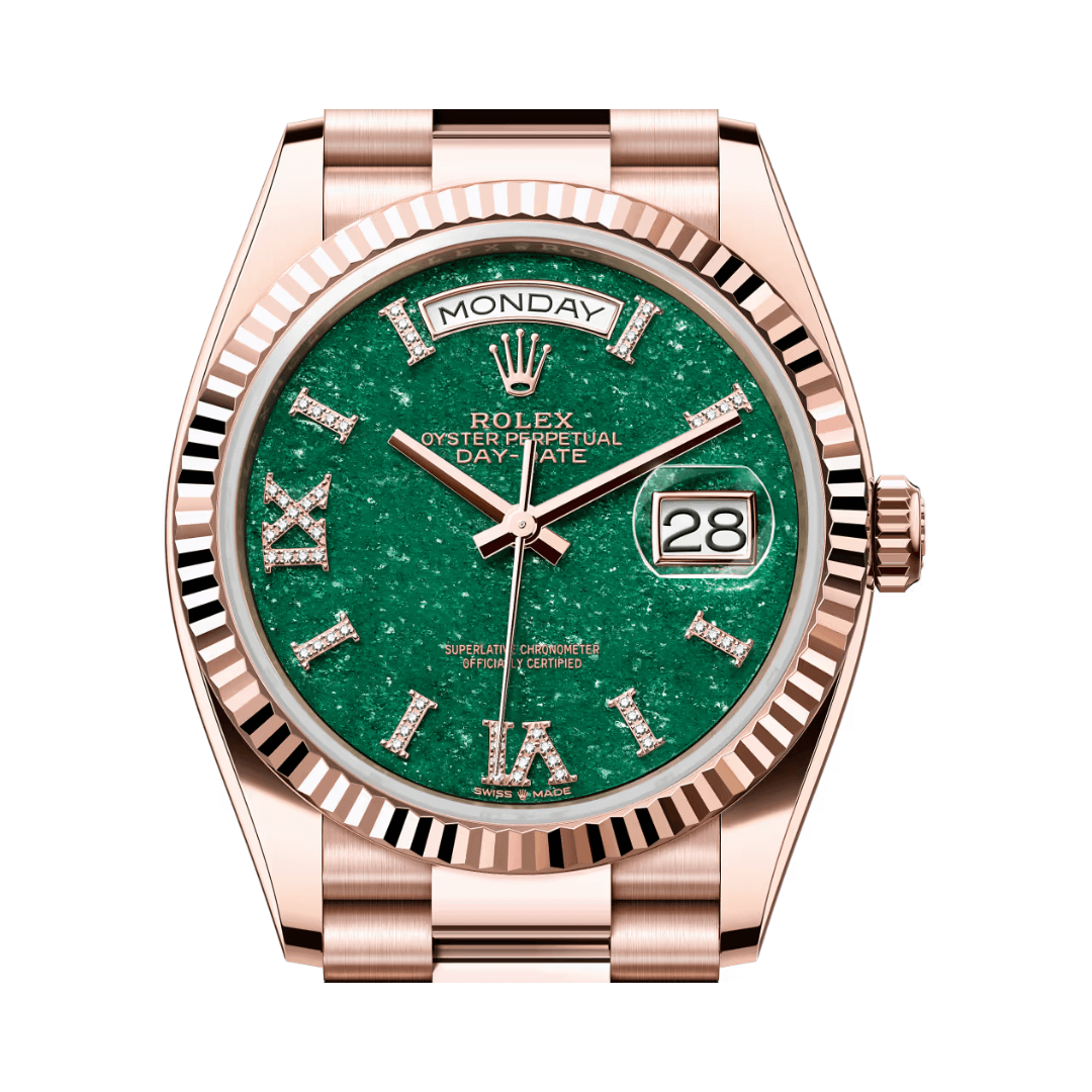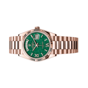 The Rolex Day Date Aventurine 128235-0068 is a luxurious women’s watch made from 18kt Everose gold. It features a 36mm round case with a fluted bezel, showcasing Rolex’s signature craftsmanship. The scratch-resistant sapphire crystal with… Available – your luxury watch destination.
