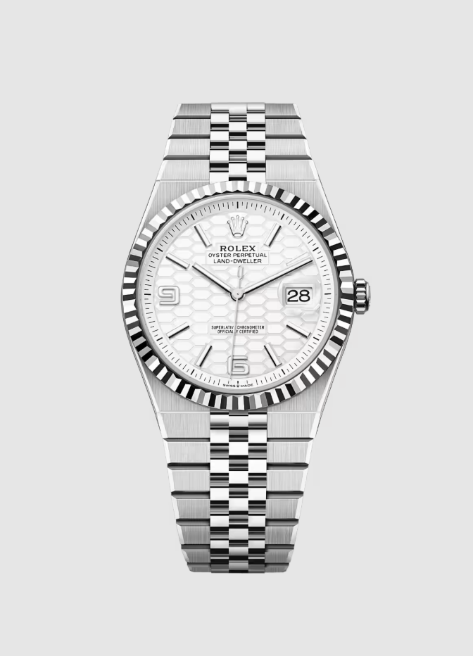 The Rolex Land-Dweller 40 M127334-0001 is a modern luxury timepiece that combines innovative design with classic Rolex craftsmanship. Featuring a 40mm Oystersteel and white gold case, fluted bezel, and a distinctive honeycomb-pattern dial, this watch delivers both durability and elegance. Powered by a self-winding automatic movement with approximately 66-hour power reserve, it ensures precision and reliability. With its integrated Flat Jubilee bracelet and 100m water resistance, this watch offers comfort, performance, and versatility?making it an ideal choice for everyday wear and high-end collections.