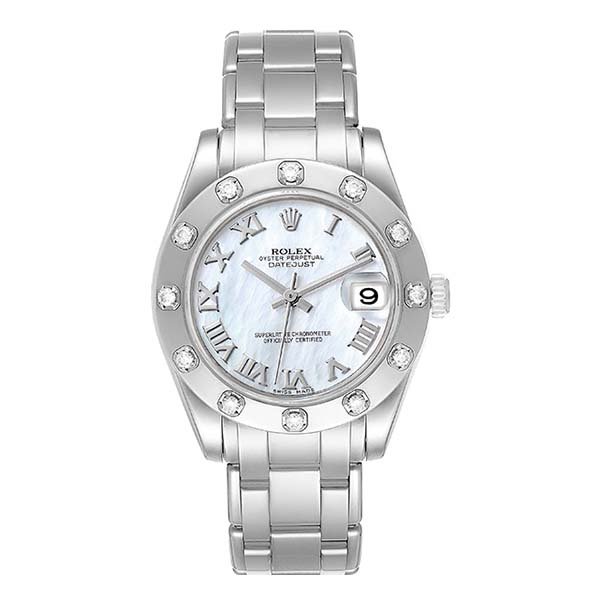 Rolex Pearlmaster 81319 Midsize Mother of Pearl Roman 34mm White Gold Diamond Ladies Rolex Pearlmaster Midsize MOP White Gold Diamond Ladies Watch 81319 features chronometer self-winding movement with quickset date function. 18k white gold oyster… Available – your luxury watch destination.