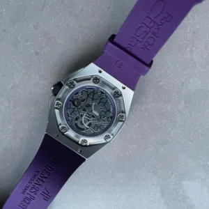 The Royal Oak Concept Black Panther Flying Tourbillon Super Clone is a bold collector inspired timepiece featuring a 42mm sandblasted titanium case with white gold bezel. Showcasing a striking black and purple dial with flying tourbillon and hand wound Caliber 2965 movement, it delivers exceptional mechanical presence and avant-garde design.