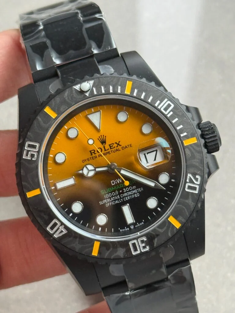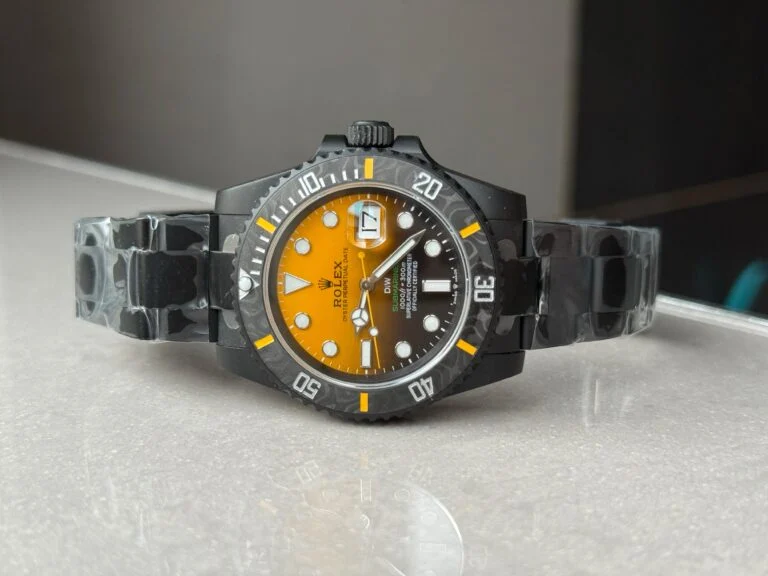 The Rolex Submariner DIW DLC VSF 1:1 Best Edition Super Clone features a bold black and orange dial housed in a 40mm DLC coated case. Powered by the reliable VS3135 automatic movement, it offers exceptional durability, a unidirectional rotating bezel, and 300m water resistance with a sporty DLC bracelet design.