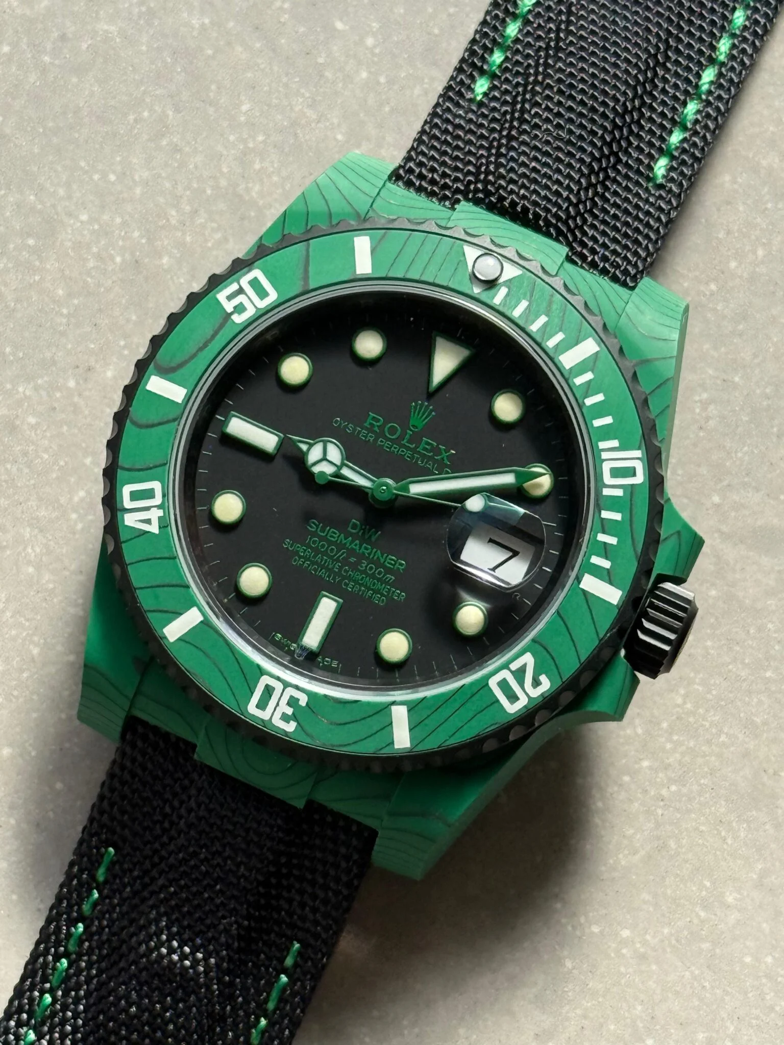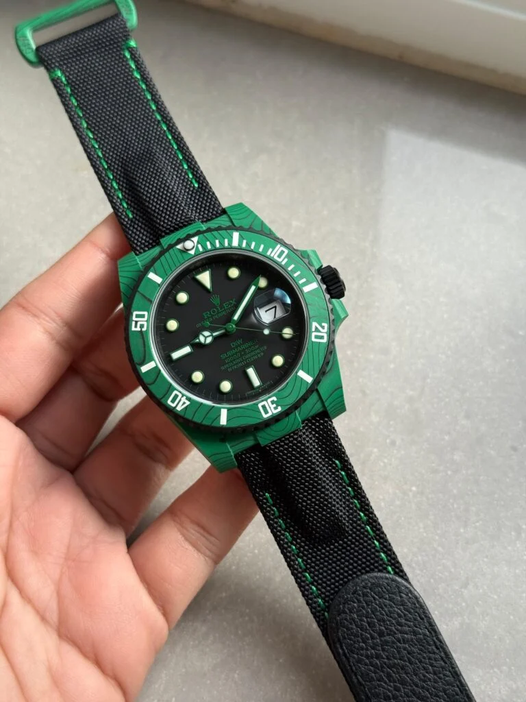 The Rolex Submariner DIW Green Carbon VSF 1:1 Best Edition Super Clone features a unique green carbon 40mm case with a black dial and luminous markers. Powered by the reliable VS3135 automatic movement, it combines lightweight durability with a sporty black nylon strap and bold DIW styling.