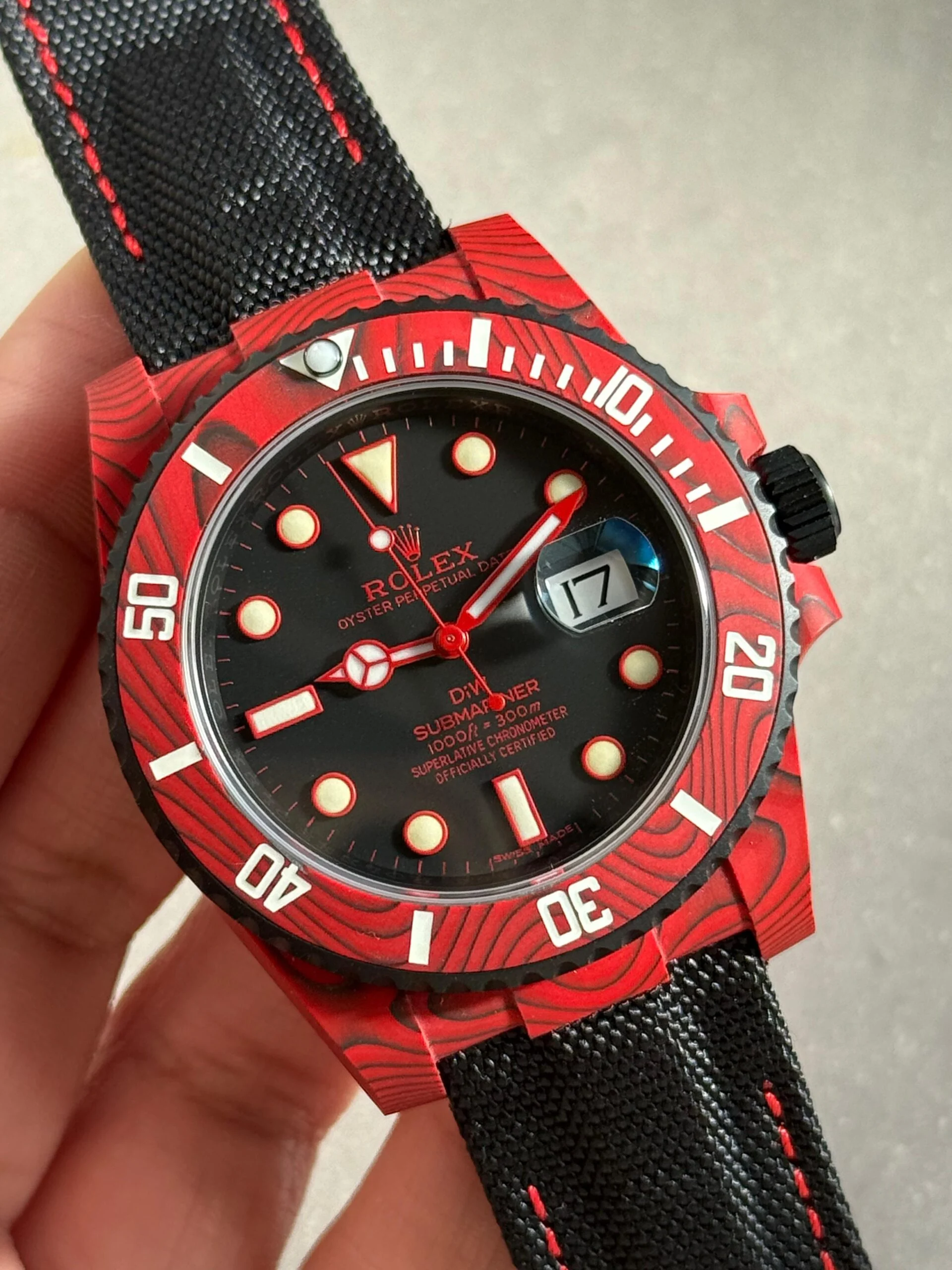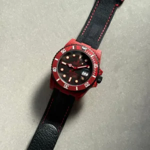 The Submariner DIW Red Carbon VSF 1:1 Best Edition Super Clone features a striking red carbon 40mm case with a black dial and luminous hour markers. Powered by the reliable VS3135 automatic movement, it offers bold styling, precision timekeeping, and a lightweight black nylon strap for a sporty look.
