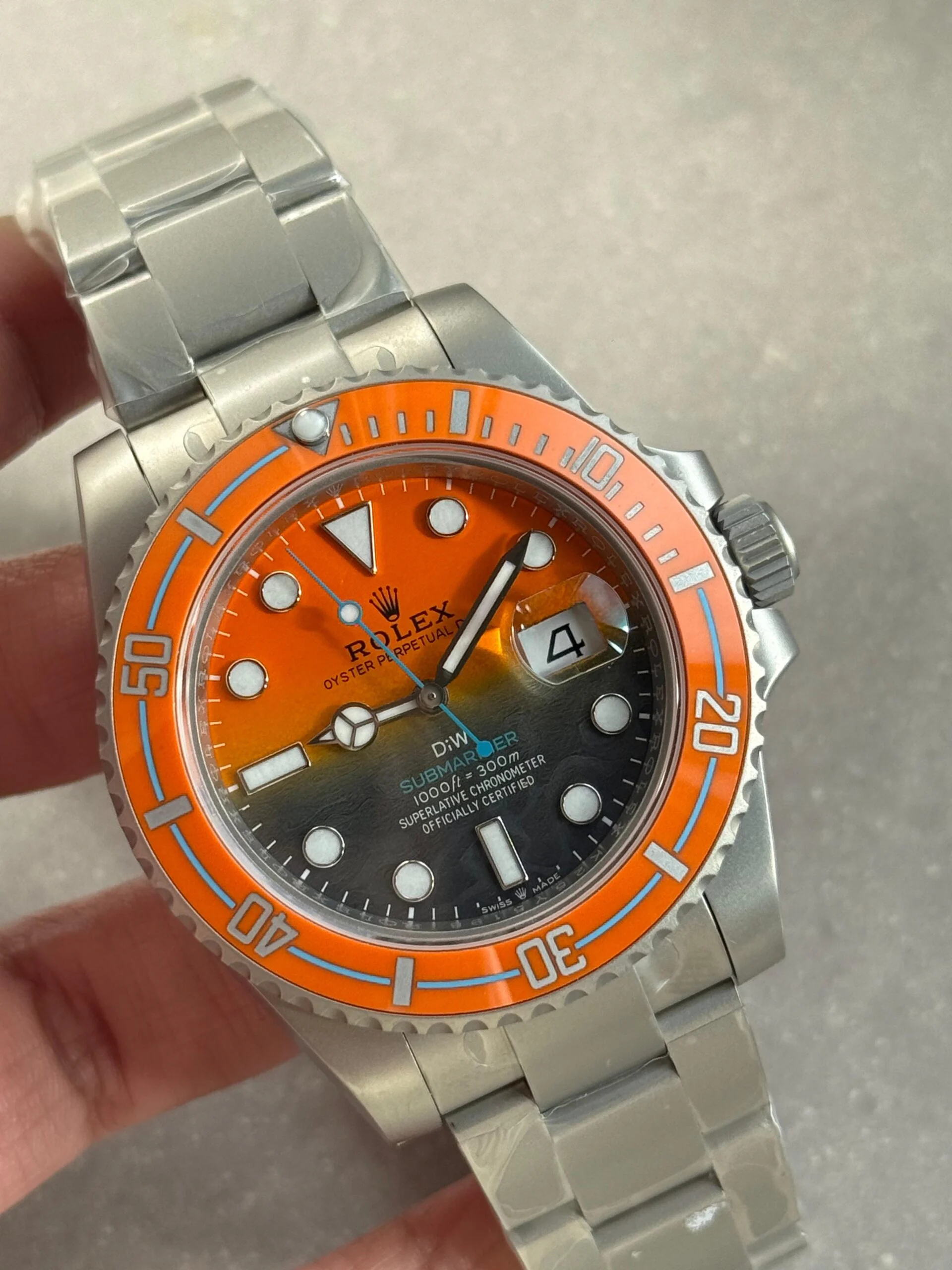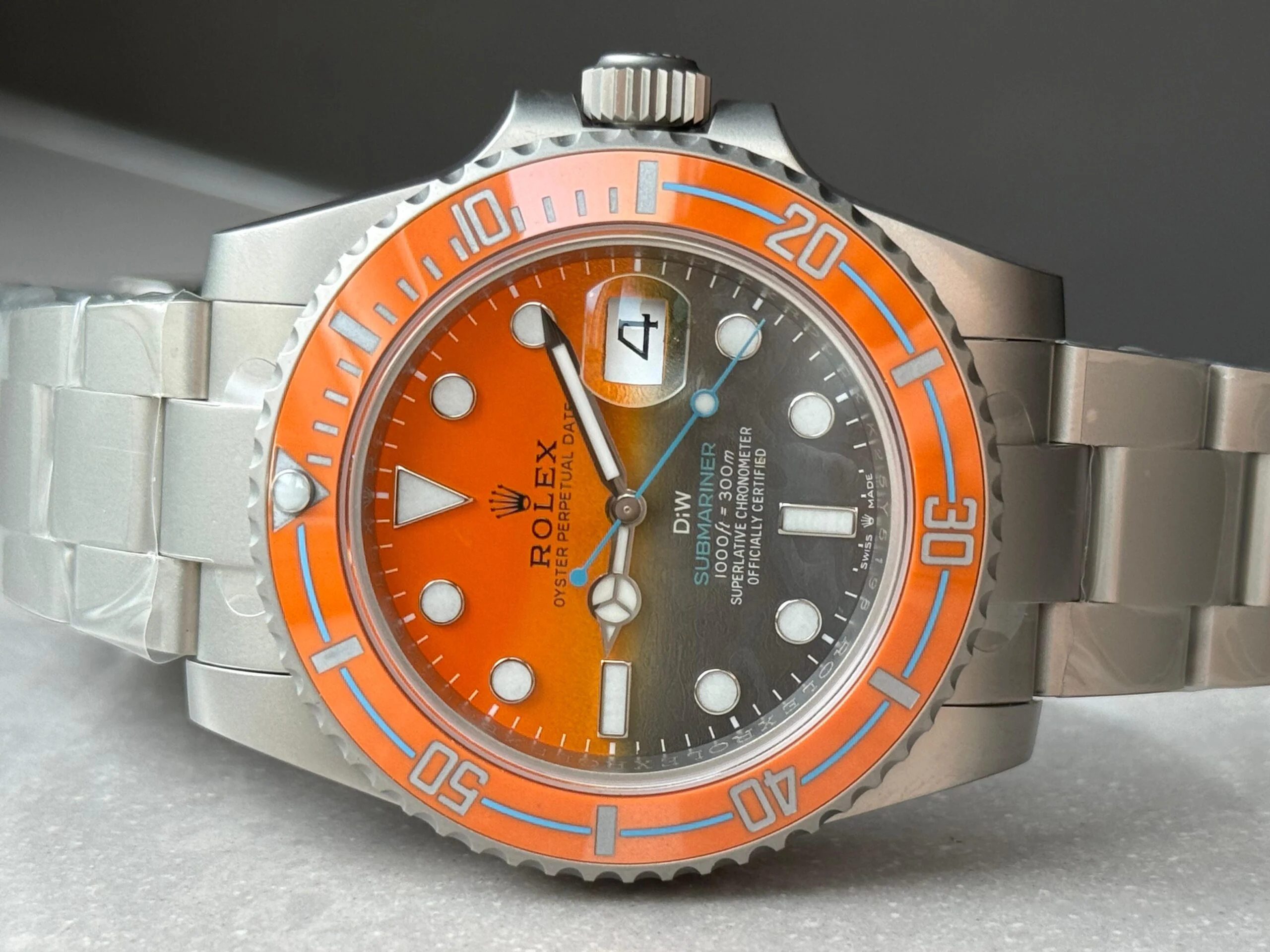 The Submariner DIW Sandblasted VSF 1:1 Best Edition Super Clone features a bold orange and grey dial housed in a 40mm sandblasted stainless steel case. Powered by the VS3135 automatic movement, it offers 300m water resistance, Mercedes hands, and a classic Oyster bracelet for a sporty luxury finish.