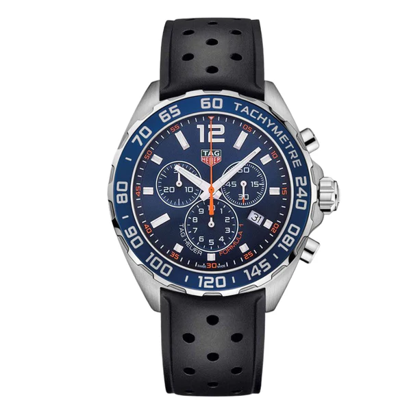 Tag Heuer Formula 1 men?s watch featuring a blue dial, quartz chronograph movement, and black rubber strap. With a 43mm case and 200m water resistance, it offers a perfect blend of sporty performance and everyday style.